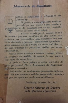 Com poesias, pequenas efemérides (registro de datas importantes) de nossa cidade, lista dos povoadores, passatempos e variedades. Esse impresso é quase uma fotografia de 113 anos atrás tamanha a riqueza de detalhes que traz Jundiaí era uma pacata cidade com 11 mil habitantes e o almanaque enaltecia as águas cristalinas da Serra do Japi, os médicos, a Banda Musical dos Empregados da Cia. Paulista, a Matriz e seu belo jardim (foto principal, acima). Também tratava do folclore. Havia a Dança dos Caiapós na Festa do Divino organizada pelo João Pratudo, um tipo popular muito querido pela sociedade da época. Nessa festa, os lavradores faziam ofertas ao Divino: carroças de lenha, flores e fruta. Os carros saíam da zona rural em desfile e quando chegavam ao centro da cidade eram precedidos pela banda e as ofertas eram entregues ao povo que se aglomerava esperando sua chegada.