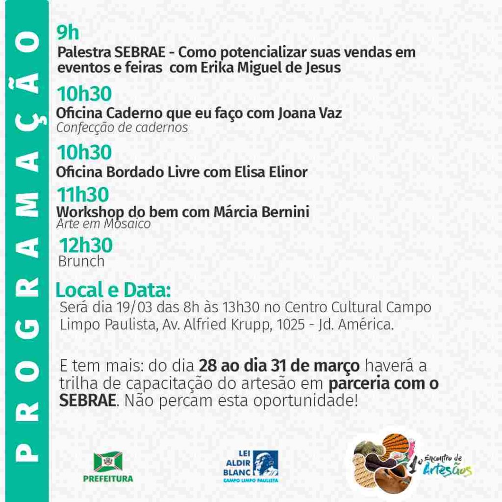 O 1º Encontro de Artesãos de Campo Limpo Paulista acontecerá neste sábado(19). O evento, promovido pela Unidade de Gestão de Cultura, acontecerá no Centro Cultural das 8h às 13h30 e abrirá espaço para troca de vivências e experiências. A programação diversificada(abaixo) possibilita contatos com profissionais e amantes da arte.