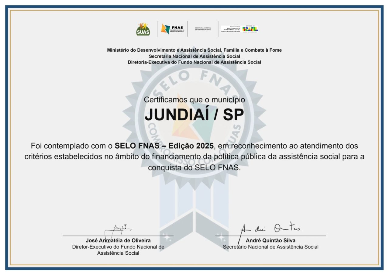 Com foco na transparência e no uso responsável dos recursos públicos, Jundiaí foi reconhecida com o Selo FNAS 2025, certificação que comprova a excelência na gestão dos recursos da Secretaria de Assistência e Desenvolvimento Social. O resultado coloca o município entre os poucos do país que atenderam aos critérios técnicos exigidos. A certificação de Jundiaí e outras cidades podem ser conferidas diretamente no site oficial do FNAS (clique aqui).