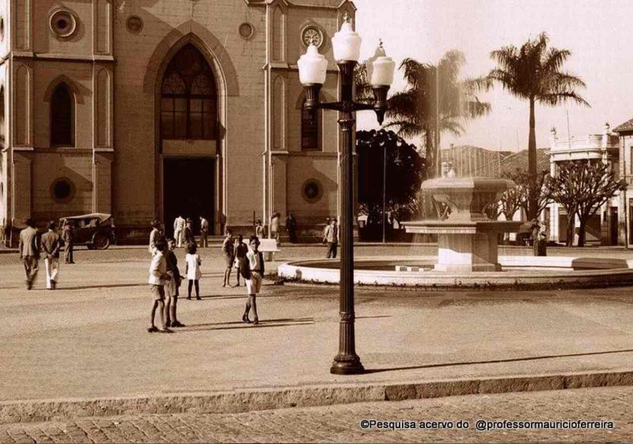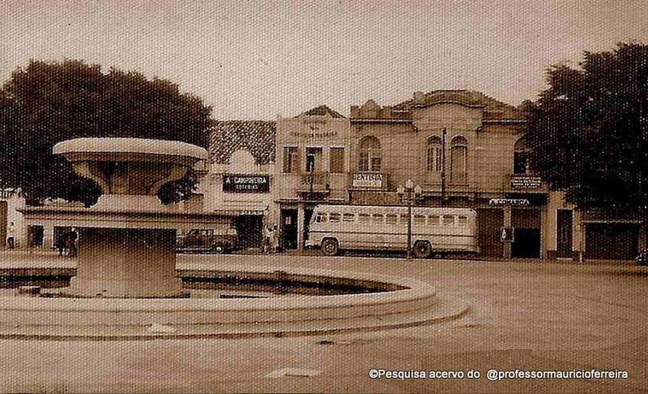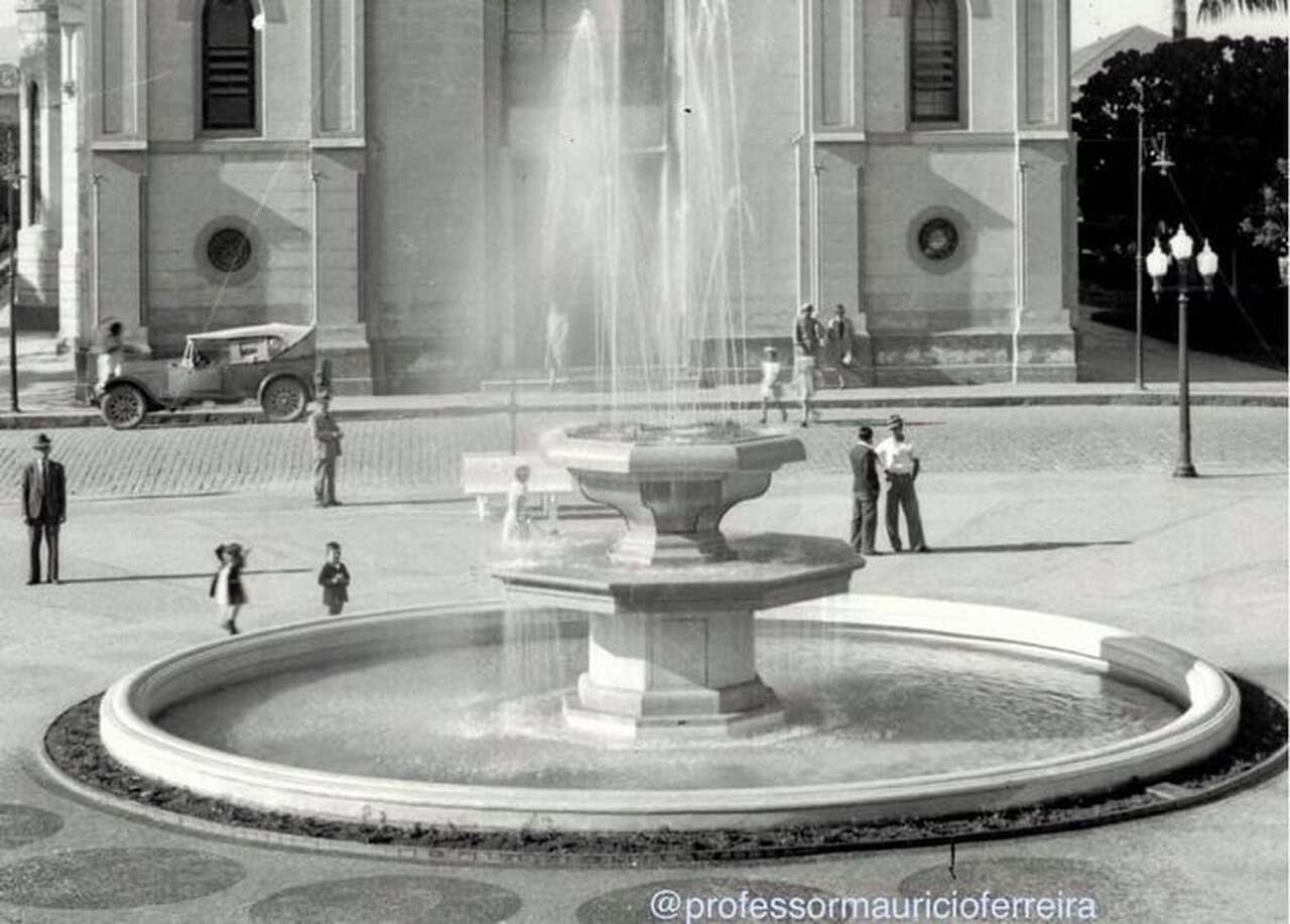 Nosso belo chafariz, também conhecido como fonte luminosa, nos anos 1940, era feito de mármore. Ficava bem na frente da Catedral Nossa Senhora do Desterro, na época chamada de Igreja Matriz. No período noturno, a fonte se iluminava. Em volta dela ocorria o footing, onde os homens andavam em sentido horário e as mulheres no sentido contrário. Era assim que os jovens da época paqueravam…