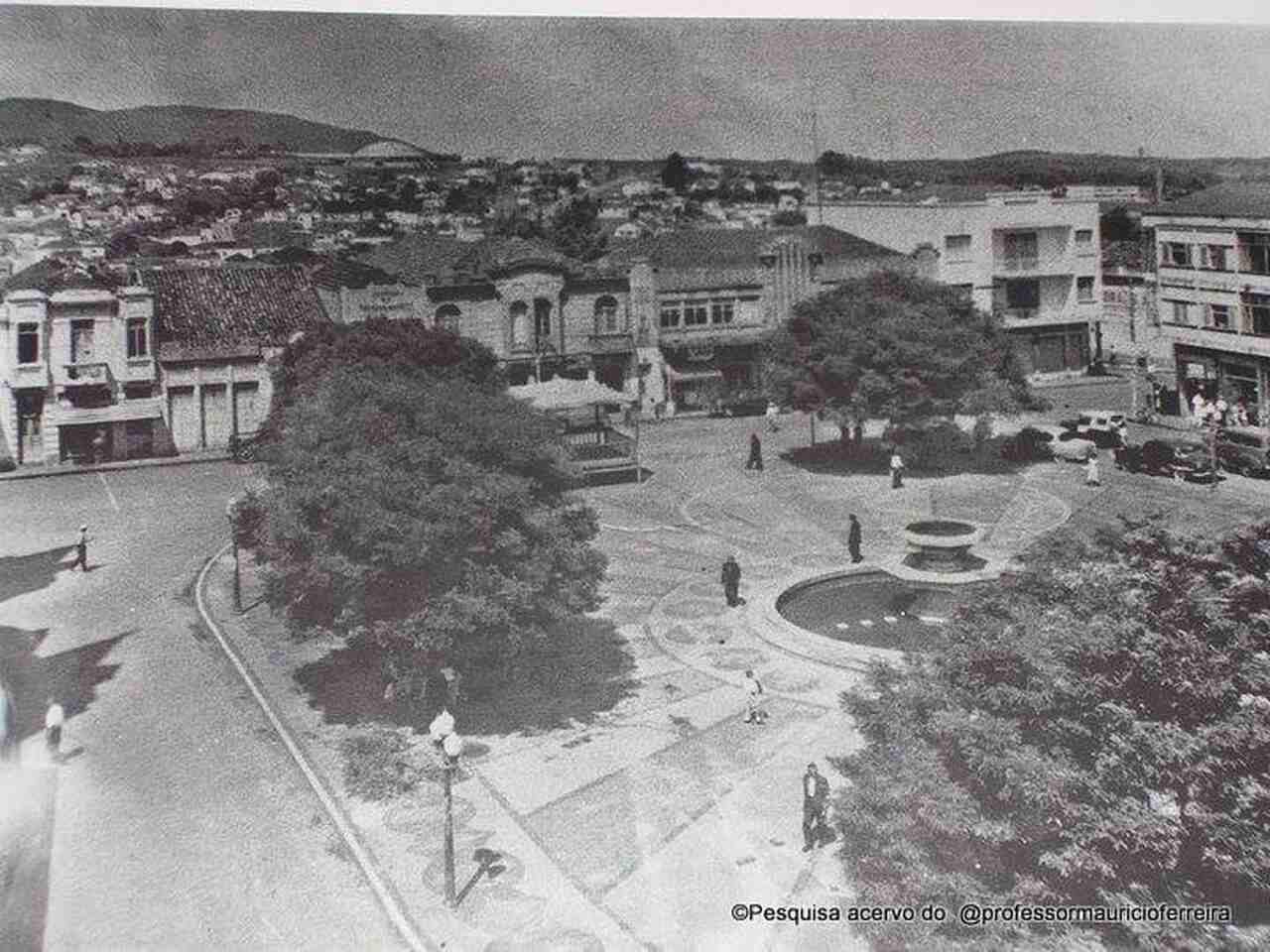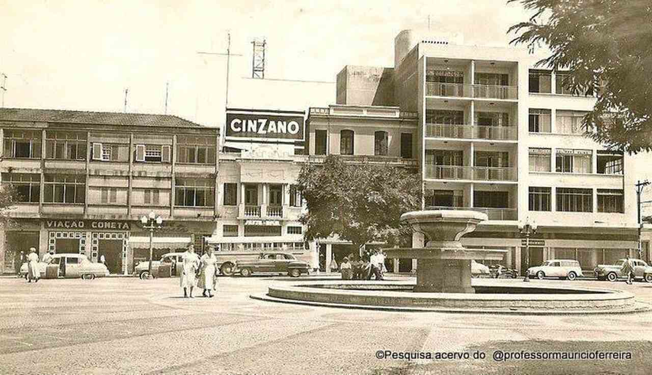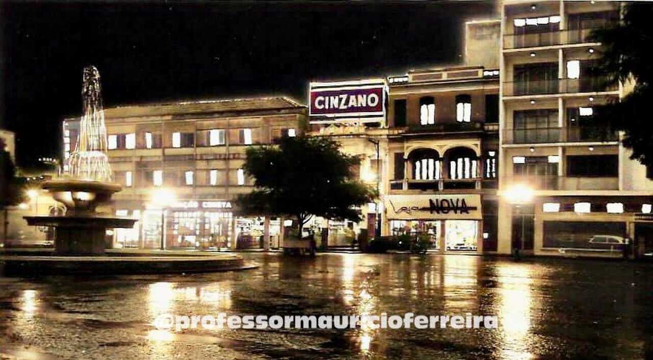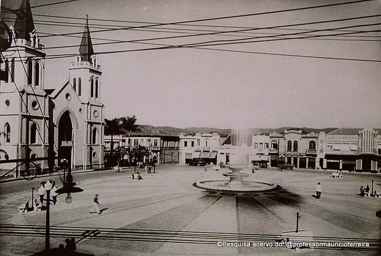 Nosso belo chafariz, também conhecido como fonte luminosa, nos anos 1940, era feito de mármore. Ficava bem na frente da Catedral Nossa Senhora do Desterro, na época chamada de Igreja Matriz. No período noturno, a fonte se iluminava. Em volta dela ocorria o footing, onde os homens andavam em sentido horário e as mulheres no sentido contrário. Era assim que os jovens da época paqueravam…