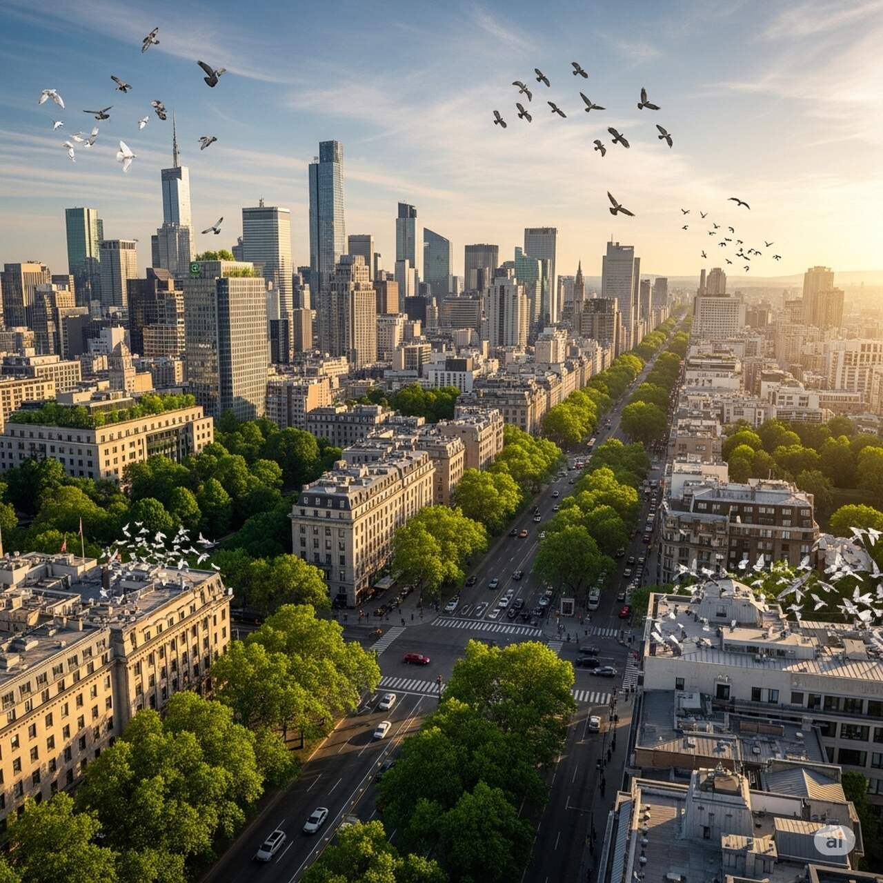 A tendência aponta para um cenário em que as cidades não apenas toleram a natureza, mas a incorporam como parte essencial de sua identidade. Ruas arborizadas, fachadas cobertas de plantas e a presença constante de animais adaptados ao meio urbano poderão ser a norma — não a exceção. Esse novo paradigma redefine o conceito de cidade, não mais como antagonista, mas como parceira do meio ambiente.(Foto: Gemini)