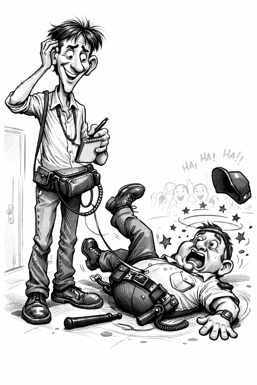 Ele usava aquele uniforme clássico: calça marrom, camisa social bege de manga curta, boné e um bendito cordão que saía da ombreira — tipo piloto de avião — e descia até o cacetete, preso na lateral do cinto. Muito educado, bateu na porta e, ao abrir, me deu passagem. Só que ficou segurando a porta com metade do corpo para dentro. Como magrelo que eu era, pensei: tranquilo. Não!