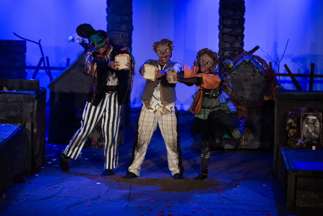 Já “R.I.P. – Uma História de Amor”(foto principal) conta a história de Mário e suas tentativas de declarar seu amor por Maria, enquanto se defende das investidas de Enrico, o Talarico. Misturando rimas, sustos e atrapalhadas, o espetáculo leva o público ao cemitério de um vilarejo qualquer, no dia do ano em que os familiares homenageiam seus antepassados e Mário vai em busca das bênçãos de sua mãe para a nova união. Quem será que leva a melhor nesta história: a alma gêmea ou a alma penada?