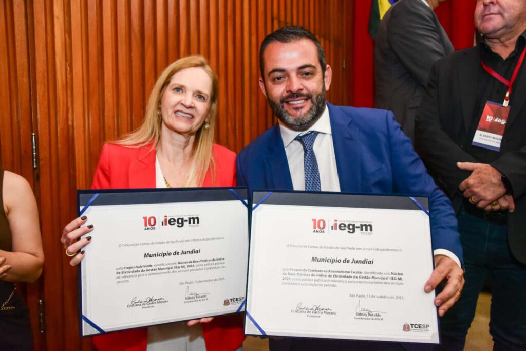 O prefeito de Jundiaí, Gustavo Martinelli, participou no Auditório Nobre do Tribunal de Contas do Estado de São Paulo (TCESP), da cerimônia que marcou os 10 anos do Índice de Efetividade da Gestão Municipal (IEG-M) — ferramenta que mede o desempenho das prefeituras paulistas em áreas essenciais da administração pública. Durante o evento, que contou com a presença do governador Tarcísio de Freitas, da presidente do TCESP, Cristiana de Castro Moraes, de conselheiros, membros, diretores e chefes de gabinete da Corte de Contas paulista, além de prefeitos, vice-prefeitos, representantes do Legislativo municipal e da sociedade civil, Jundiaí recebeu certificados de reconhecimento por boas práticas na área da Educação, com destaque para dois projetos municipais: a Horta Vale Verde, responsável pelo fornecimento de alimentos orgânicos e sustentáveis à rede de ensino, e o Projeto de Combate ao Absenteísmo Escolar, que atua na permanência dos alunos nas escolas.