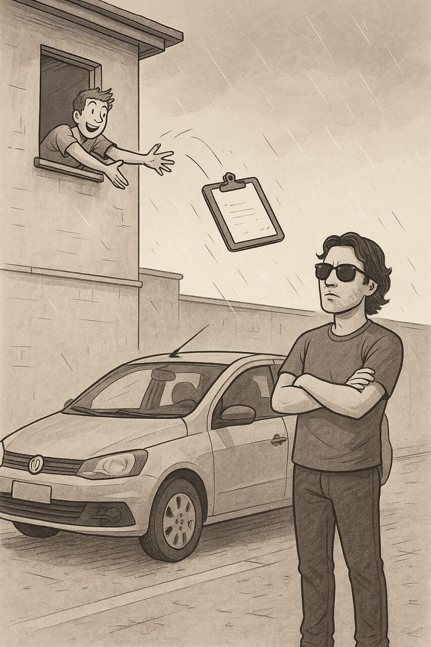 Até que um dia conseguimos deixá-lo na mesma saia justa que tanto nos fazia vestir. A empresa de manutenção das copiadoras estava lá, e o carro do técnico estacionado em frente à janela. Minha mesa ficava do outro lado, e eu, tranquilo, observava o vai e vem do gancho de prancheta pendurado na janela. Uma, duas, três… 15 vezes! Levantei e segurei o gancho. Alguém puxava de lá, eu de cá. Resolvi dar uma de Newton e empurrei o gancho para ver se acertava o engraçadinho. Claro que isso não aconteceria. Só que aconteceu outra coisa: o gancho escapou e pá! — amassou o capô do Golzinho da empresa.