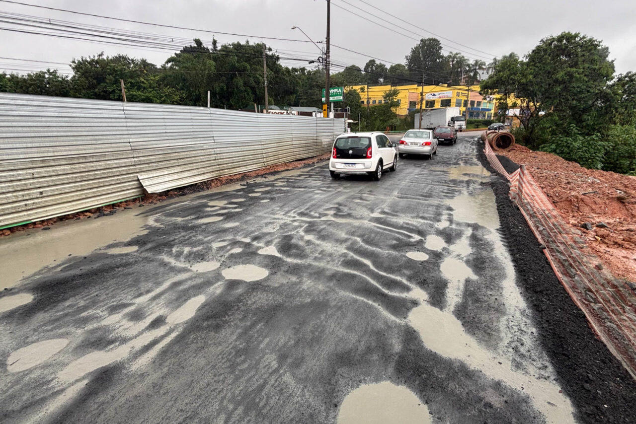 Entre as intervenções obrigatórias previstas para o projeto está a implantação do sistema de drenagem da região, obra que é de responsabilidade da empresa. Para a execução dos serviços, foi necessário realizar um desvio de trânsito temporário, o que acabou comprometendo o pavimento de uma das vias do Engordadouro utilizadas como rota alternativa.