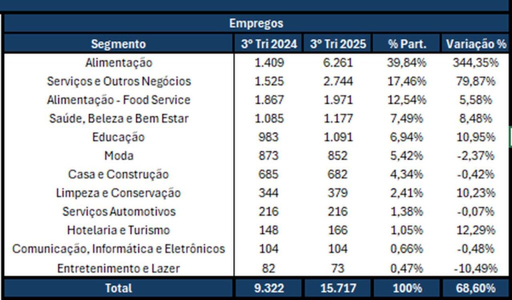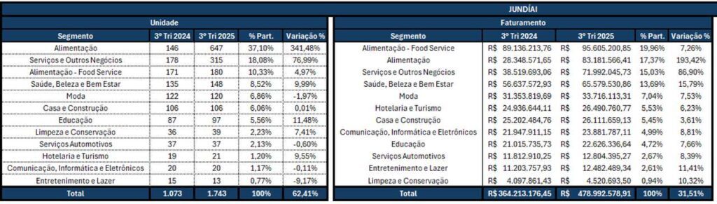 Mesmo com a economia em ritmo menor, o mercado de franquias brasileiro manteve sua movimentação, gerando empregos e renda, e registrou um crescimento nominal de 10,8% no acumulado dos últimos 12 meses, e de 9,1% no terceiro trimestre, aponta a Pesquisa Trimestral de Desempenho realizada pela ABF- Associação Brasileira de Franchising. Em Jundiaí, o setor cresceu 32%, com faturamento chegando a R$ 478.416.283,00. No mercado de franquias local, o primeiro lugar ficou com o food service, com pouco mais de R$ 89 milhões, seguido pelo setor de saúde, beleza e bem-estar(quase R$ 57 milhões). Serviços faturou cerca de R$ 38 milhões. Em termos de empregos, o setor de alimentação gerou 6.261 no terceiro trimestre do ano passado, em Jundiaí. No mesmo período de 2024 foram 1.409. Serviços gerou 2.744 empregos. Food service, 1.971.(veja tabelas abaixo)