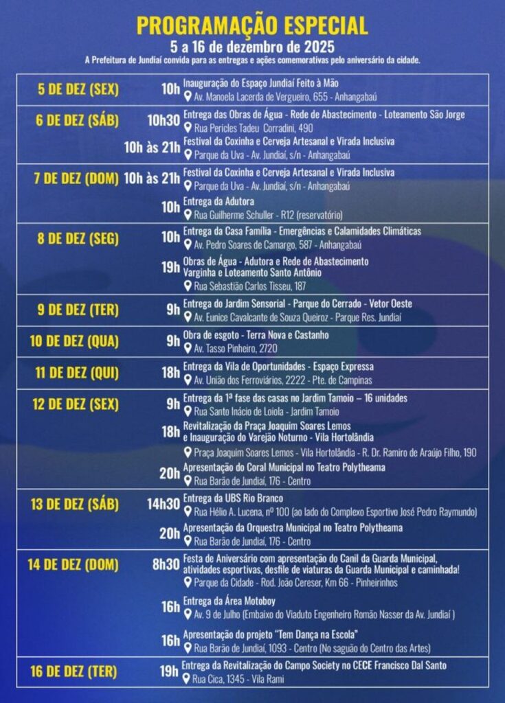 Como parte das celebrações pelos 369 anos de Jundiaí, comemorados no próximo dia 14, a Prefeitura preparou uma programação especial que destaca mais de 10 importantes entregas de obras, serviços e novos equipamentos públicos para a população. A agenda tem início nesta sexta-feira (5), com a inauguração do Espaço Jundiaí Feito à Mão, no Anhangabaú, e segue ao longo do final de semana com diversas entregas, além do Festival da Coxinha e Cerveja Artesanal, que ocorre simultaneamente à Virada Inclusiva, no Parque Comendador Antônio Carbonari (Parque da Uva). Nos dias seguintes, outras entregas importantes serão realizadas, entre elas a Casa Família – Emergências e Calamidades Climáticas, o Jardim Sensorial no Parque do Cerrado (Vetor Oeste), a Vila de Oportunidades no Espaço Expressa e a UBS Rio Branco. Já no dia 14, o domingo será marcado por festa, com a presença do Canil da Guarda Municipal, entrega de novas viaturas, atividades esportivas e atrações culturais.