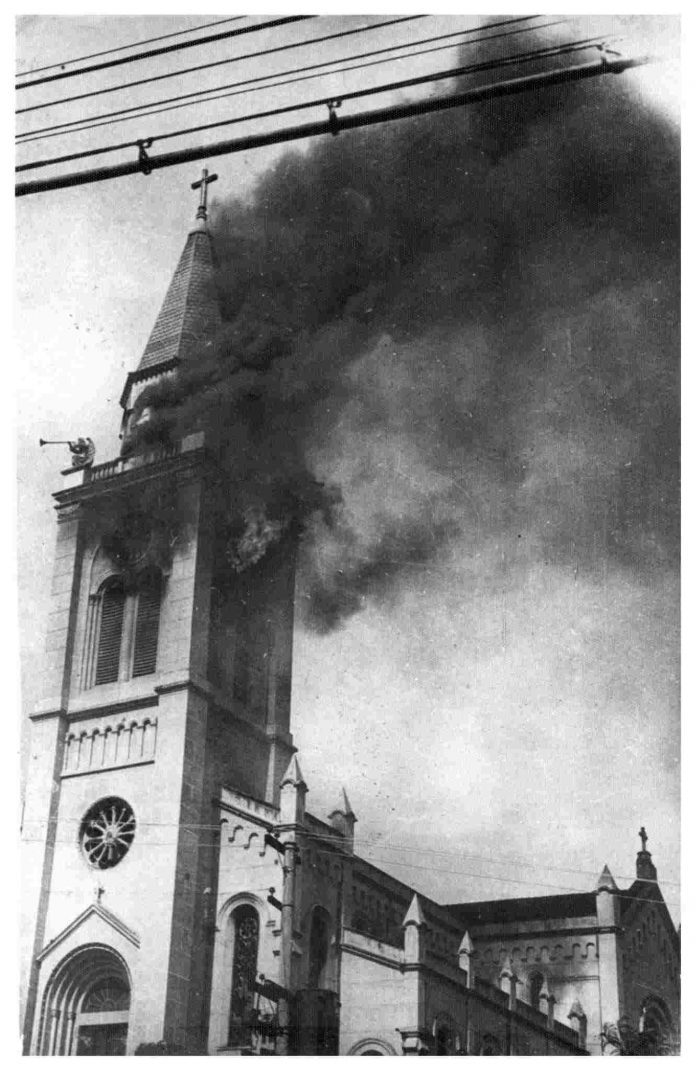 De acordo com o relato de Breternitz, “uma grande quantidade de voluntários foi ao local, esvaziando a igreja, pois temia-se que o fogo atingisse o resto do prédio. Empresas da cidade como a Cica e Argos, que tinham brigadas de bombeiros, apoiaram os bombeiros da cidade. Foi necessária a ajuda de três guarnições de São Paulo, que melhor equipadas (inclusive com escada Magirus), auxiliaram no combate ao incêndio. Um desses voluntários ficou levemente ferido, tendo sido atendido pelo Samdu(Serviço de Assistência Médica Domiciliar de Urgência), órgão que ficava no lado direito na descida da Rua Major Sucupira, perto da antiga Companhia de Comunicações do Exército, a Ciacom”.