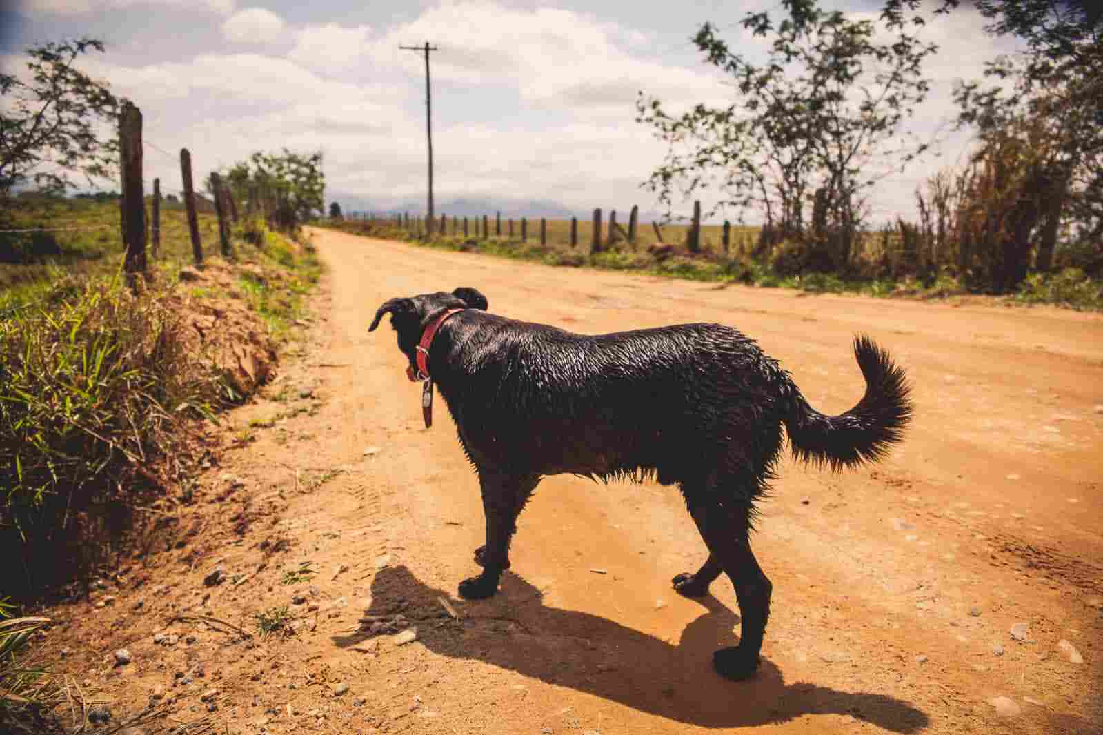 Ao lado da estradinha de terra tinha um lindo riacho. Era a prova de que estávamos no caminho errado. Eu não me lembrava deste córrego. Aliás, como poderia esquecer dele? De repente escuto o barulho de algo caindo nas águas cristalinas do riacho. Era o cão peregrino mergulhando nele, se refrescando. Não demorou muito ele saiu do riacho e voltou a me acompanhar. Seguimos um pouco mais para frente e vimos uma fazenda, um casarão e uma roda d’água. Agora era certo que estávamos no caminho errado. Decidi voltar.Andamos dois quilômetros no sentido oposto até chegar a bifurcação novamente. Dois para ir, dois para voltar. E eu fazia as contas nos dedos. Seguimos pela estrada da direita e um quilômetro à frente apareceu uma setinha apontando para o Caminho da Fé. Repeti para o cão: Pê, vamos tirar o atraso e prosseguir no sentido contrário…