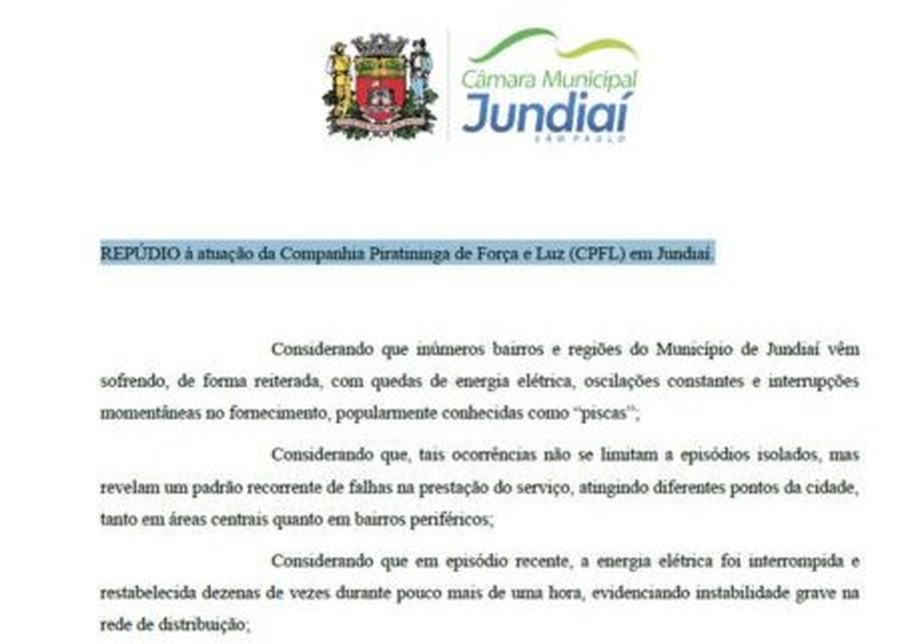 Na moção, Martins afirma que os piscas não se limitam a episódios isolados e revelam um padrão recorrente de falhas na prestação do serviço, atingindo diferentes pontos de Jundiaí cidade, tanto em áreas centrais quanto nos bairros”. O parlamentar citou as oscilações ocorridas no Pacaembu. “A empresa minimizou os efeitos e desconsiderou os transtornos enfrentados diariamente pela população já que aparelhos podem ser danificados”, enfatizou ele.