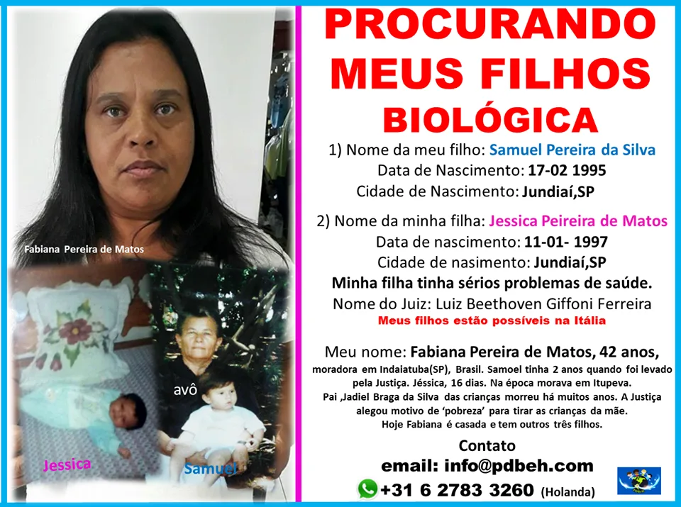 O desespero de Fabiana é tanto que ela começou a supor que os filhos poderiam ter sido adotados por um casal holandês. Ela encontrou a ONG PDBeH – Pessoas Desaparecidas Brasil Holanda – no Facebook e começou a conversar com a voluntária Liza Silva que passou a ajudá-la, mesmo com chances remotas de achar Samuel e Jéssica. Sem nenhuma pista, o trabalho da ONG é dificultado e, levando-se em consideração que as crianças de Jundiaí foram adotadas por casais da França, Itália, Holanda, Israel, Alemanha e Estados Unidos, procurar os filhos de Fabiana é algo praticamente impossível.