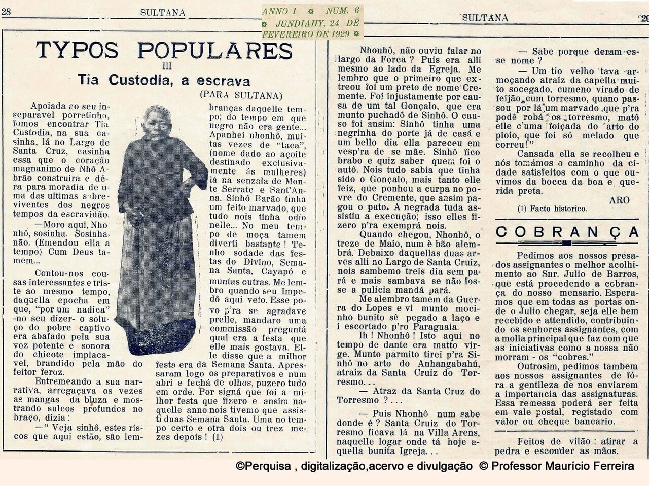 O título ‘Typos Populares III – Tia Custodia, a escrava’ dá entender que outras duas pessoas já tinham sido entrevistadas e eram tidas como muito conhecidas na época. A publicação é um documento histórico que mostra, através dos olhos de quem enfrentou a escravidão, como foi aquele período sombrio. Por outro lado, Tia Custódia não caiu no esquecimento. Assim com Nhá Lau e outras, ela faz parte da ‘Rota Afro’, onde é relembrada e celebrada. Confira:
